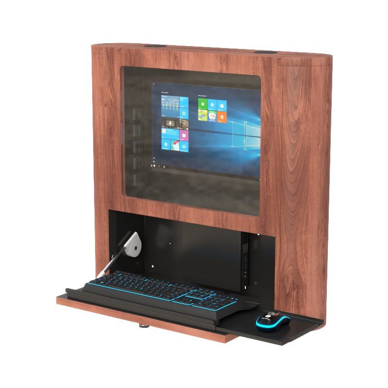 Cuenta con una cubierta de plexiglás de larga duración, un soporte para el monitor de pantalla plana y una bandeja plegable para el teclado que también sirve de armario para el ordenador. Diseñado especialmente para entornos sanitarios, de oficina e industriales.