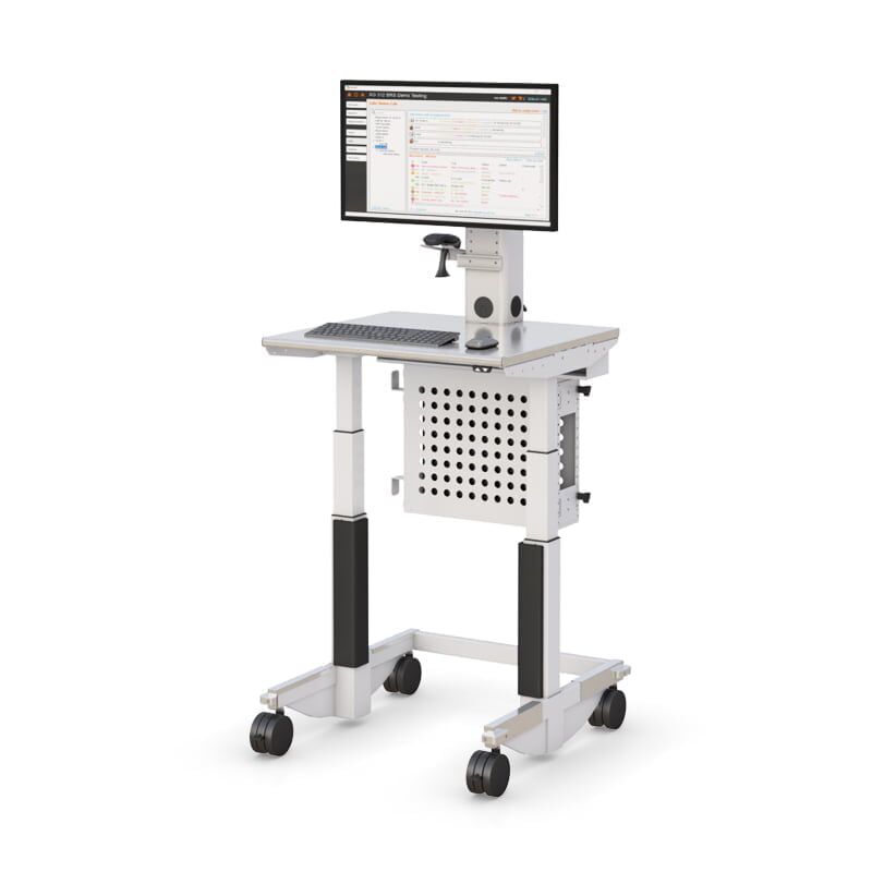 Carro móvil para salas limpias con ajustes de altura para sentarse o levantarse con sólo pulsar un botón. Este carro está equipado con un soporte para uno o dos monitores, un armario para el ordenador ventilado y seguro, y una regleta de enchufes integrada, una gran superficie plana de escritorio y ruedas de suave rodamiento para facilitar la maniobrabilidad