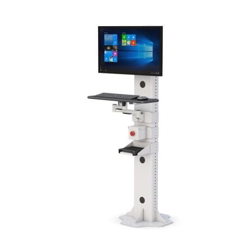 Este soporte de ordenador industrial montado en el suelo requiere un espacio mínimo. Es un equipo fundamental en las líneas de producción industrial. Cuenta con una robusta base fija montada en el suelo y un bastidor en forma de H que lo convierten en un puesto de trabajo informático muy fiable.