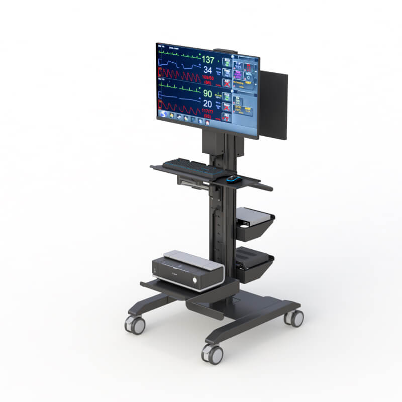 Este soporte de ordenador ergonómico y rodante cuenta con un carro de monitores doble, compatible con VESA, con cuatro bandejas de uso, brazo en Z articulado, bandeja para el teclado, bandeja para la impresora y ruedas giratorias.