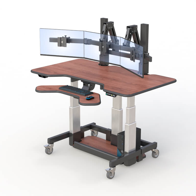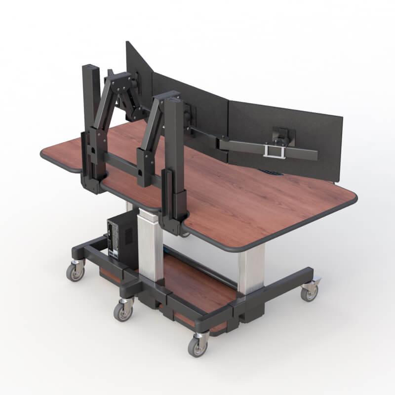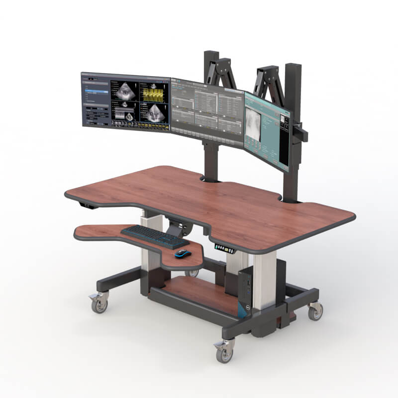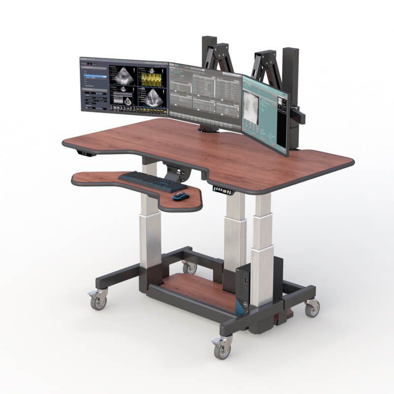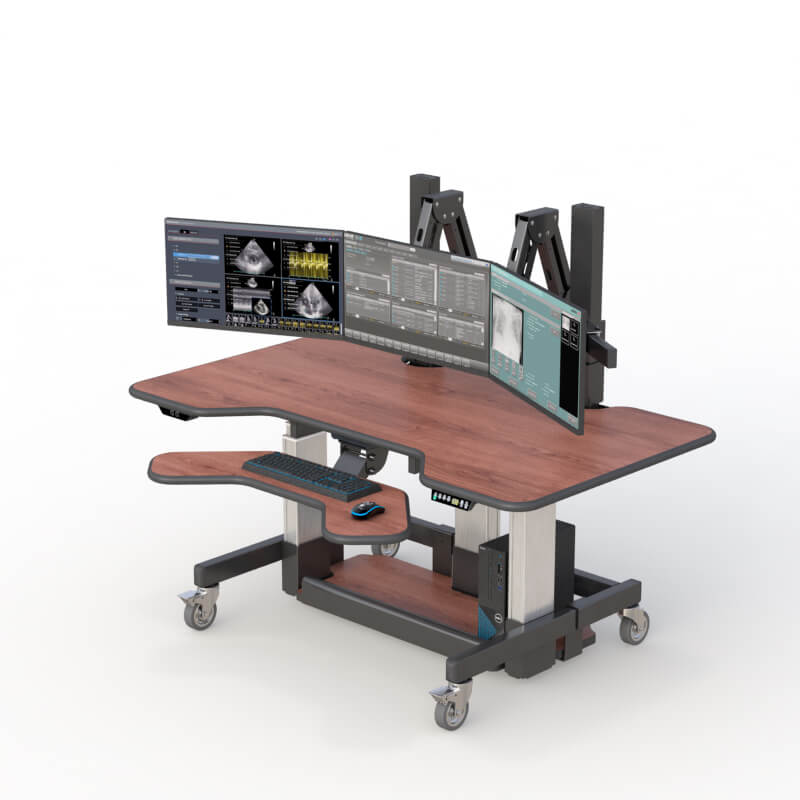 With a push of a button, the Radiology Desk can be set to either sitting or standing positions. The display monitor mounts are also independently height-adjustable with tilt and swivel-capable monitor arms that deliver the ideal monitor viewing angle. It is equipped with heavy-duty casters for easy moving.