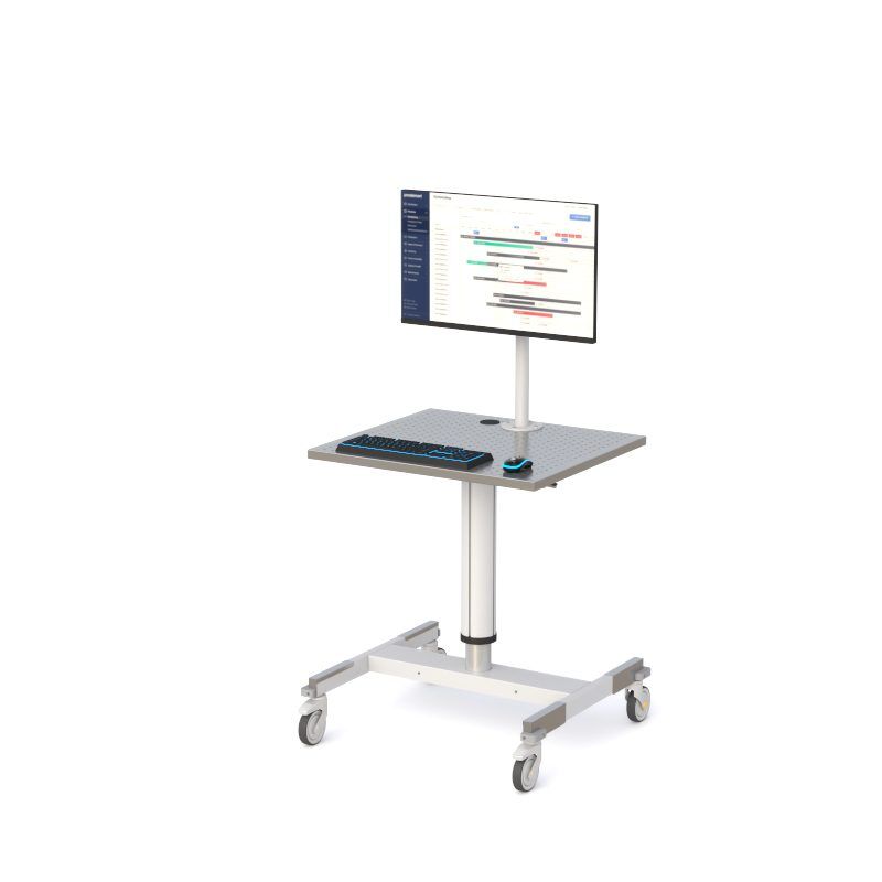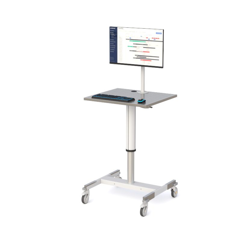 A cleanroom-ready mobile computer workstation designed for controlled environments. Featuring a 27″ × 24″ perforated metal worksurface, VESA monitor mount, pneumatic height adjustment, and optional anti-static casters, this workstation delivers stable, ergonomic, and contamination-controlled operation for ISO cleanrooms, semiconductor labs, and pharmaceutical production areas.