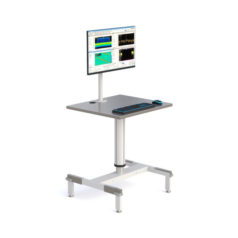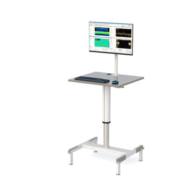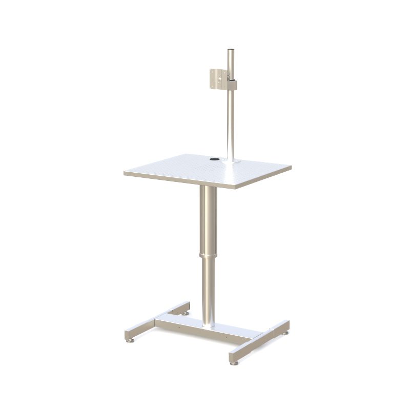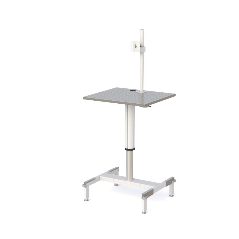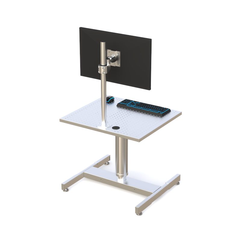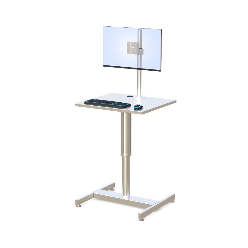 A cleanroom-ready, height-adjustable computer workstation designed for static-sensitive and contamination-controlled environments. Featuring a perforated metal worksurface, VESA monitor mount, pneumatic lift column, and four ESD-compliant glides, this unit provides stable, ergonomic, and static-safe computing for semiconductor, pharmaceutical, and laboratory cleanrooms.