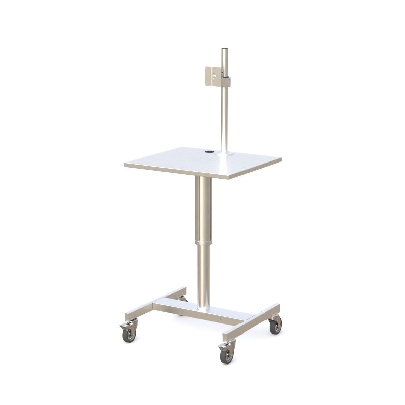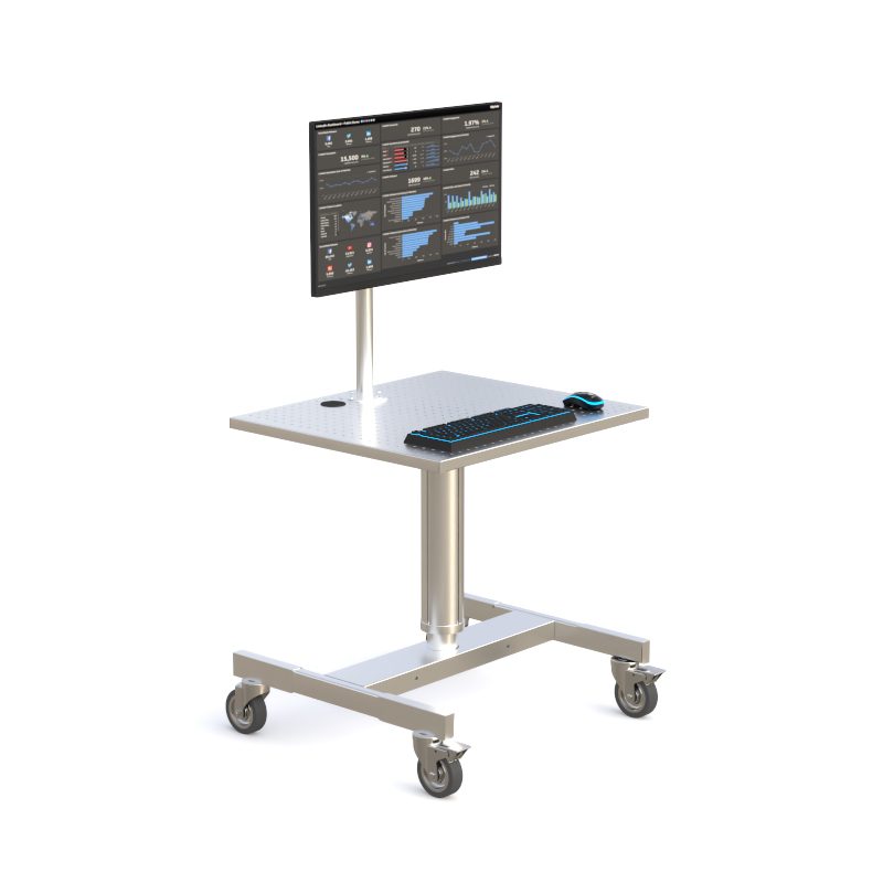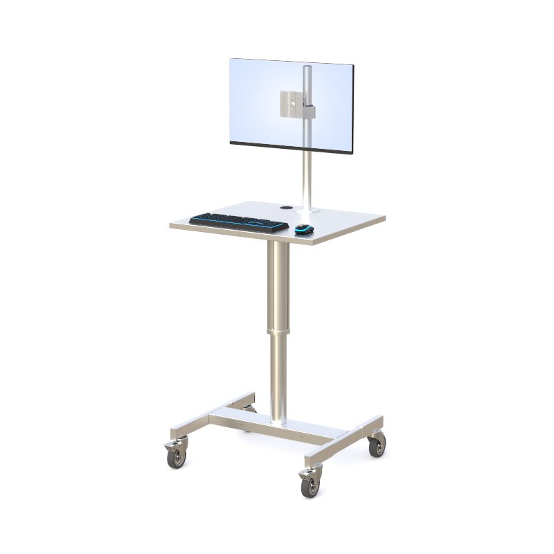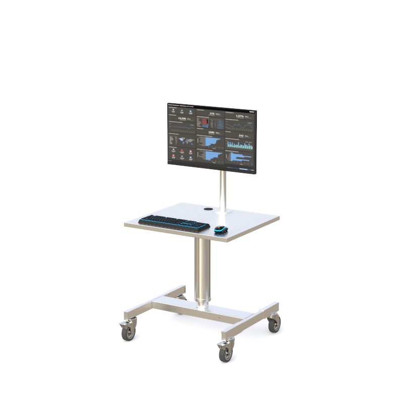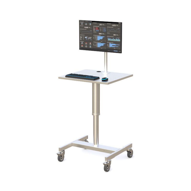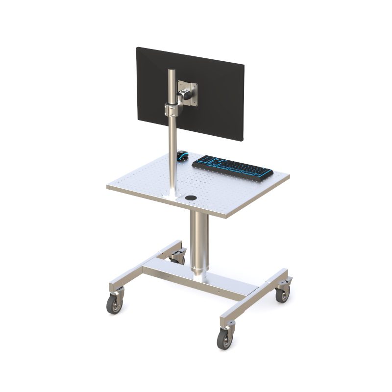 A cleanroom-ready mobile computer workstation designed for controlled environments. Featuring a 27″ × 24″ perforated metal worksurface, VESA monitor mount, pneumatic height adjustment, and optional anti-static casters, this workstation delivers stable, ergonomic, and contamination-controlled operation for ISO cleanrooms, semiconductor labs, and pharmaceutical production areas.