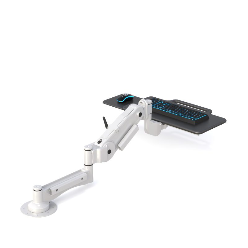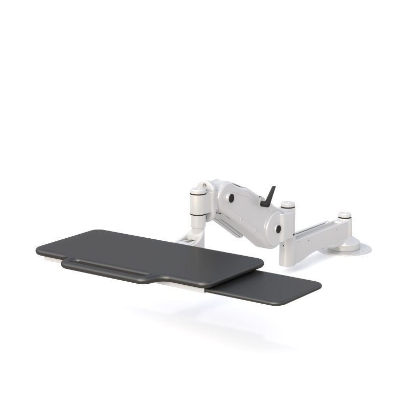 This ergonomic pneumatic keyboard arm features a foldable keyboard tray with a sliding mouse platform, allowing smooth height adjustment and flexible positioning. Its durable multi-pivot arm extends easily, saves space when folded, and provides stable, comfortable typing for medical, lab, and technical workstations.