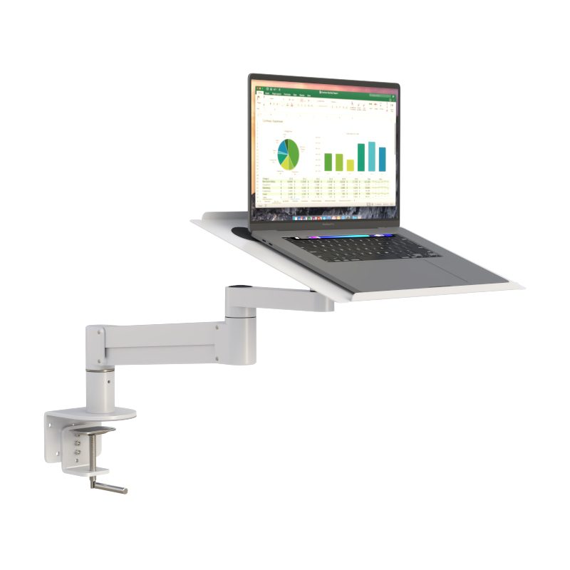 The arm mounts securely using a high-stability desktop edge pole clamp, ensuring reliable attachment to desks and work surfaces while freeing up valuable desktop space. Built with durable metal components, this adjustable laptop desk mount is ideal for environments that require flexibility, stability, and ergonomic performance.