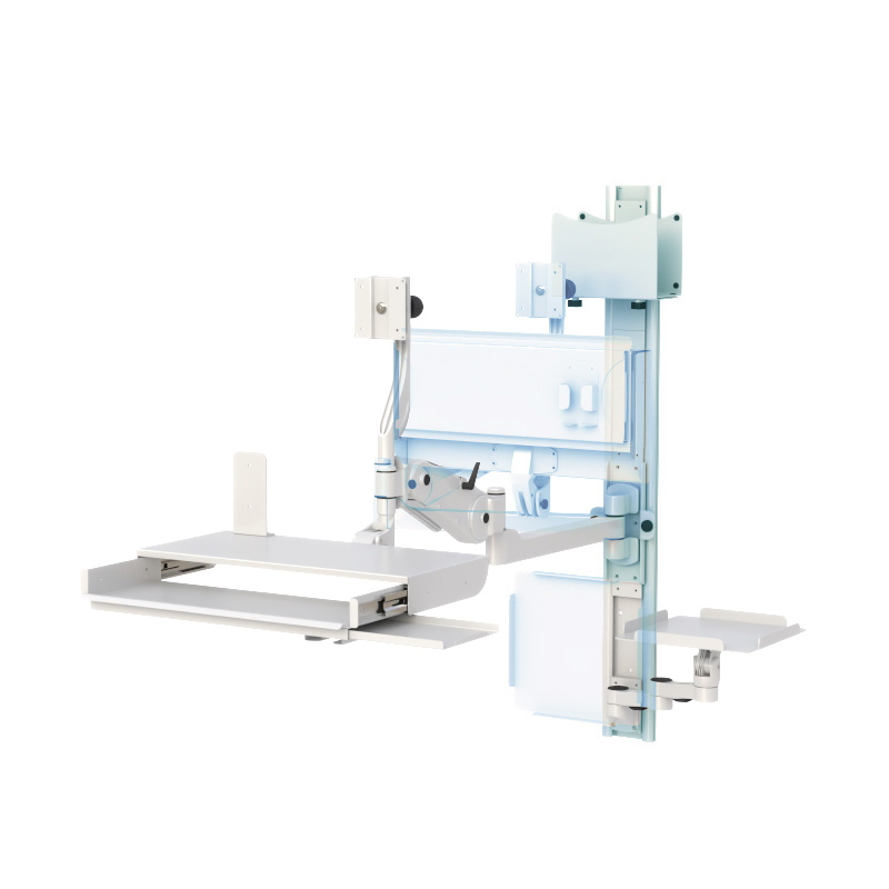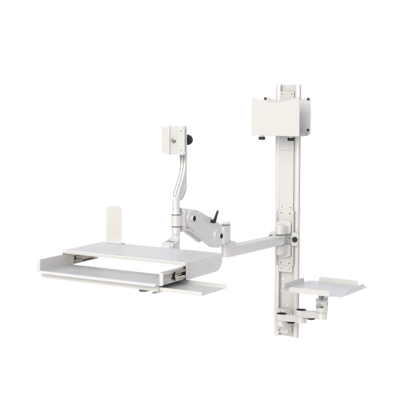 A fully adjustable wall-mounted workstation featuring a pneumatic height-adjustable monitor arm, foldable keyboard tray with safety lock, integrated CPU mount, and dedicated accessory supports. Designed for ergonomic efficiency, clean cable management, and high-performance use in medical, industrial, and technical environments.