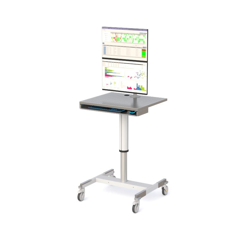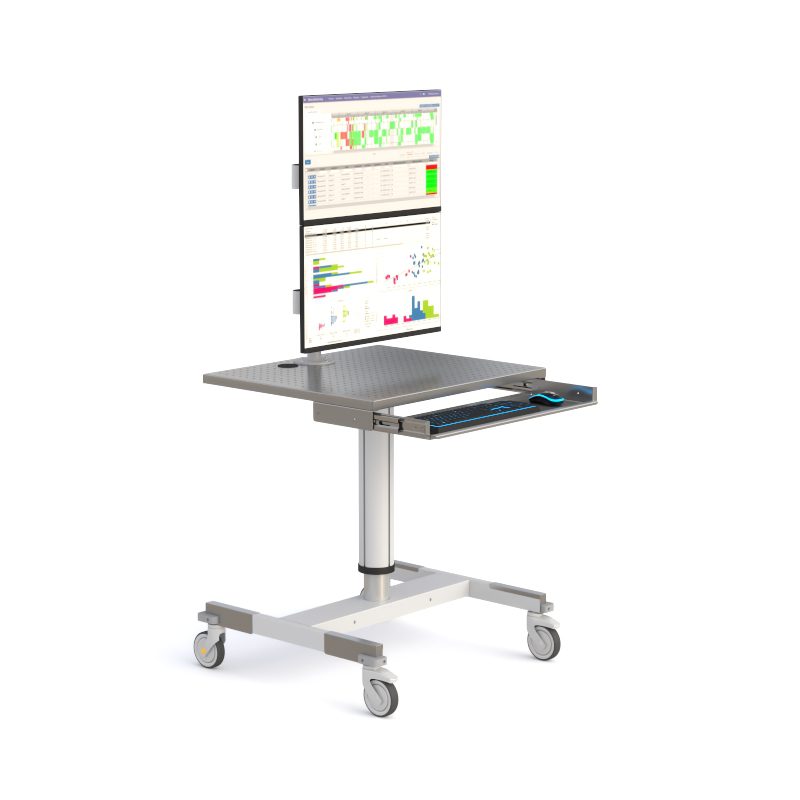 A durable, height-adjustable mobile computer workstation engineered for cleanrooms and controlled environments. Built with a perforated metal worksurface, retractable keyboard system, and VESA-compatible mounting on a 24″ pole with two Z566 monitor arms, this workstation delivers stable performance, smooth mobility, and ergonomic flexibility for demanding technical workflows.