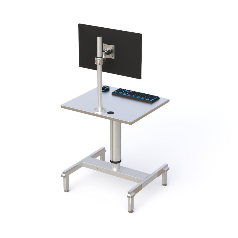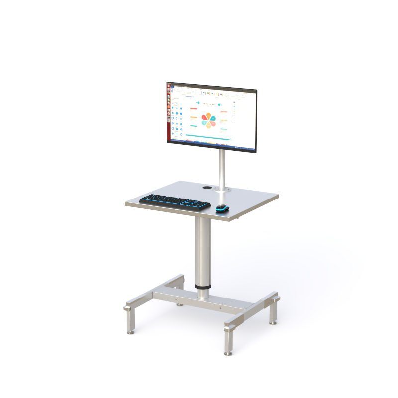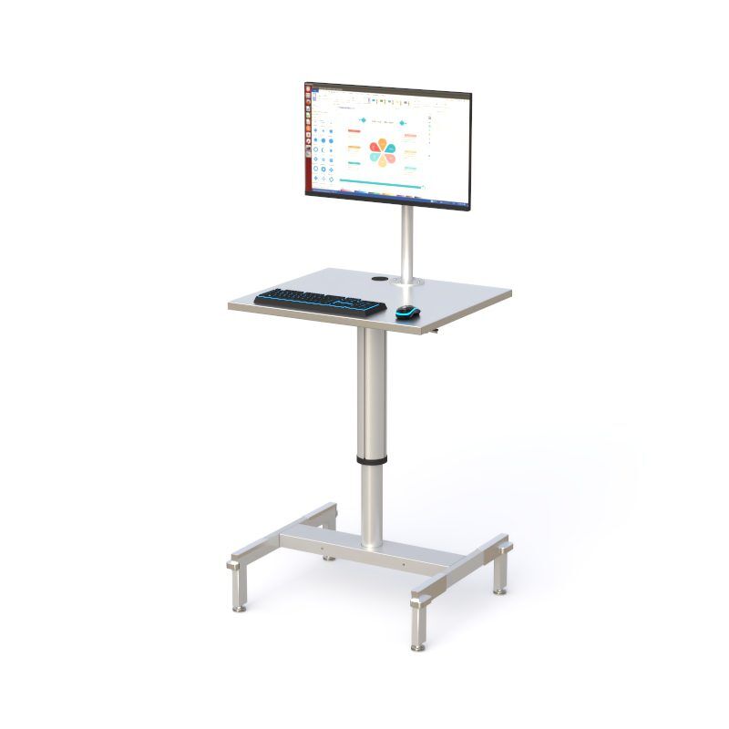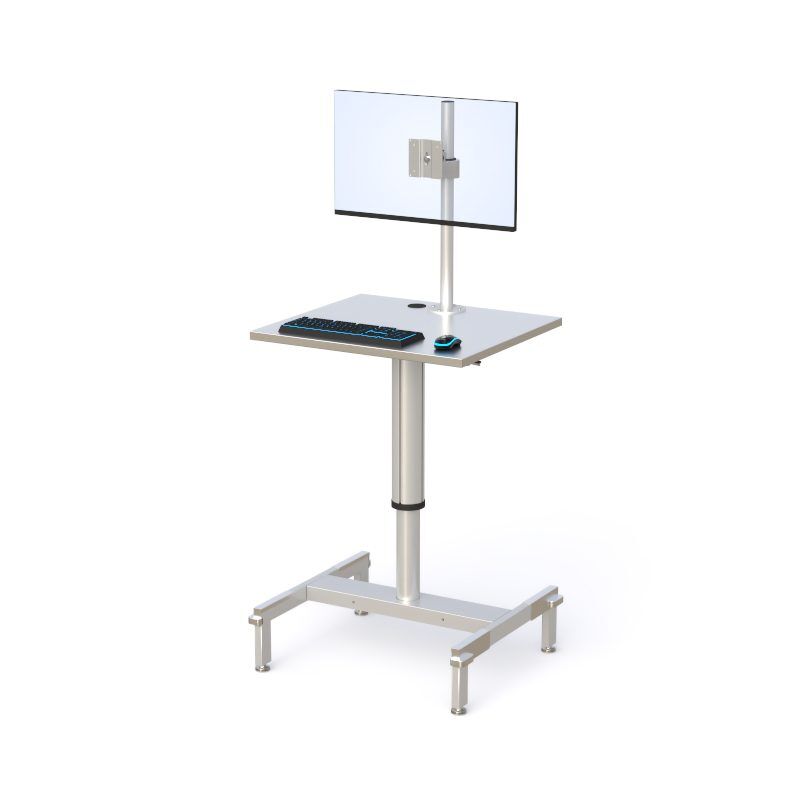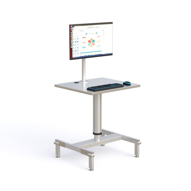 A cleanroom-ready, ESD-safe height-adjustable computer workstation with a solid, non-perforated metal worksurface, pneumatic lift column, VESA monitor mount, and ESD-compliant glides designed for contamination-controlled and static-sensitive environments.
