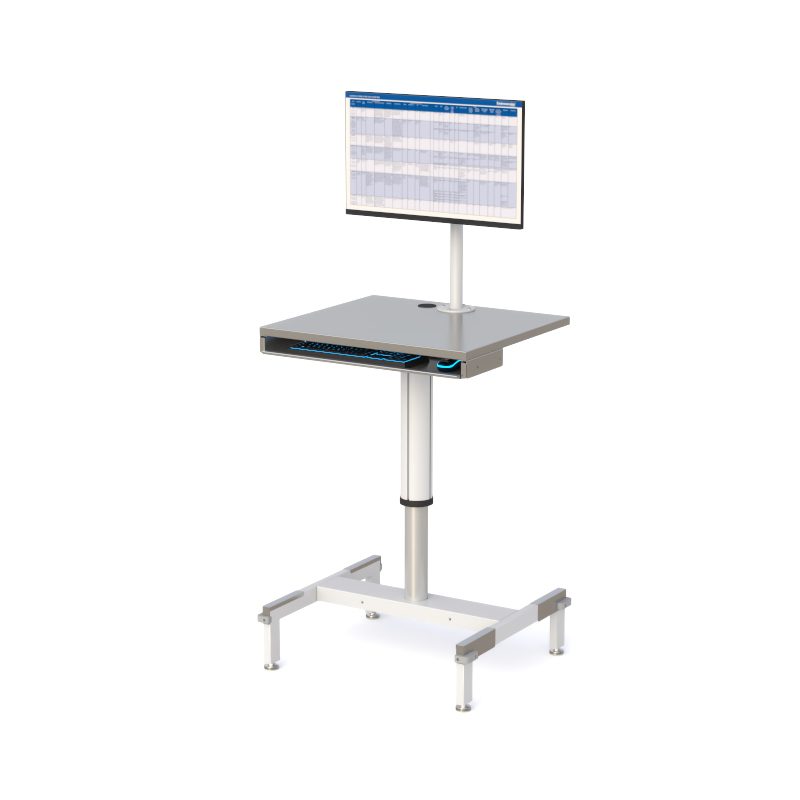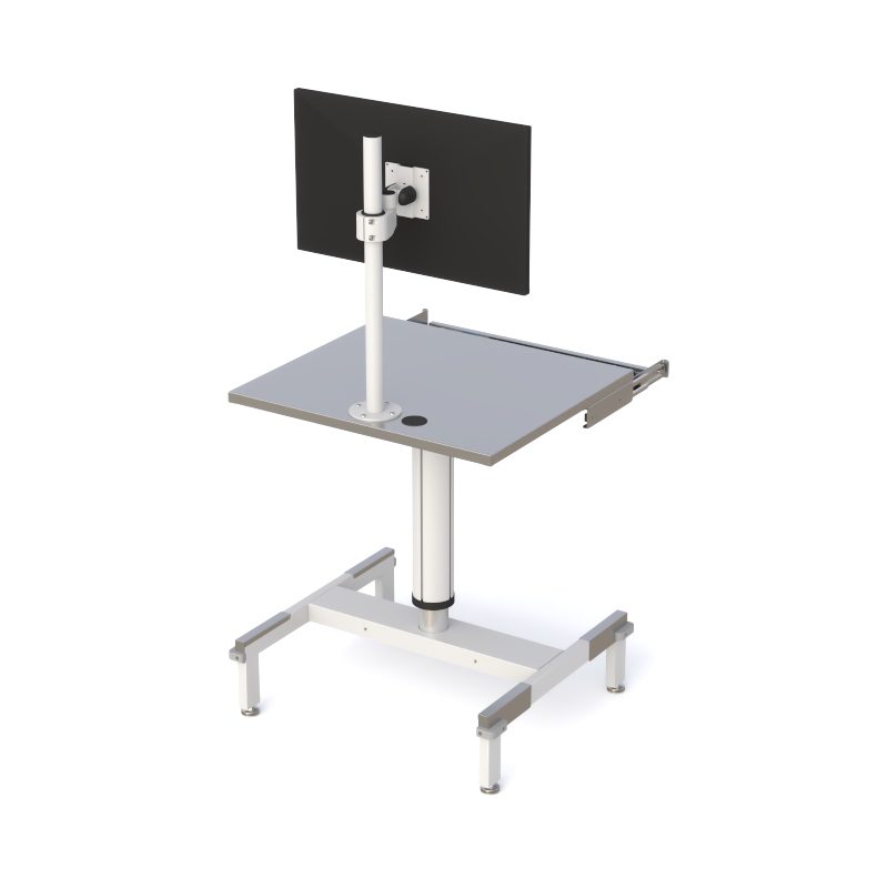 An integrated VESA 75/100 compliant monitor mount, secured to a robust 24″ metal pole, allows accurate and stable display positioning for tasks such as process monitoring, data entry, batch documentation, and laboratory information management. A retractable metal keyboard and mouse tray keeps the primary surface uncluttered while supporting ergonomic input during extended work periods.