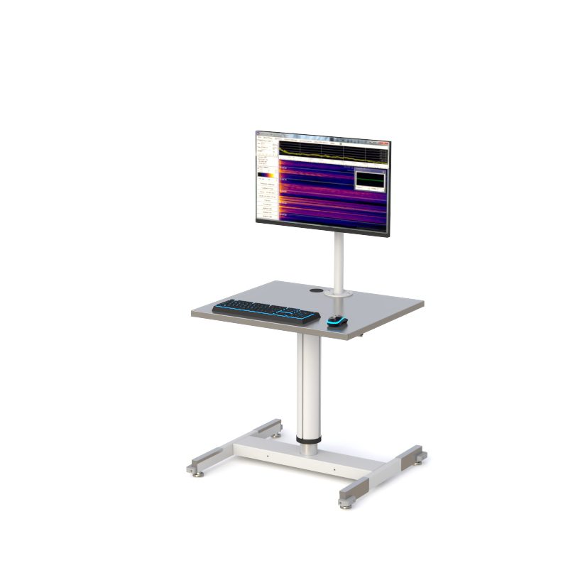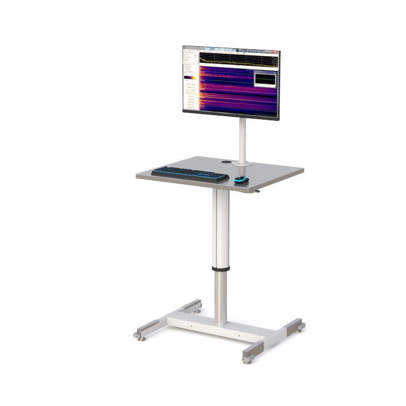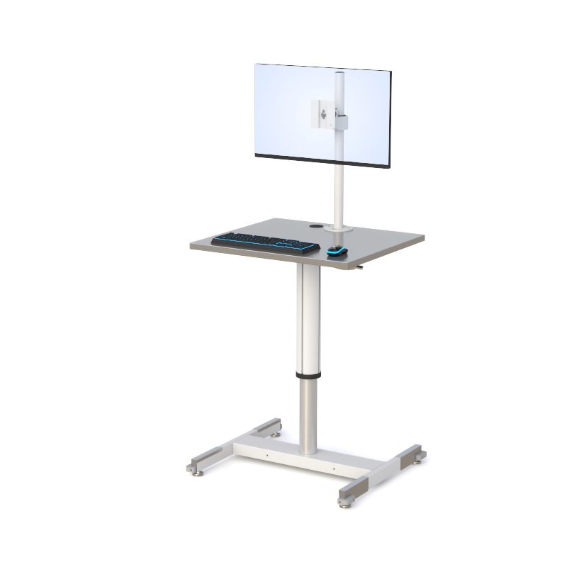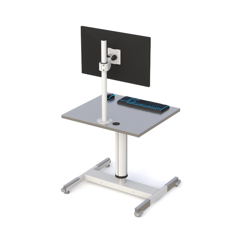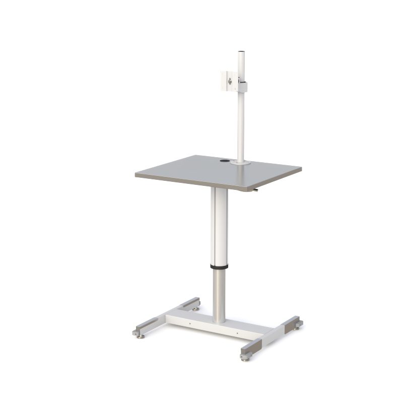 This cleanroom-ready workstation features a stainless steel work surface with a pneumatic height-adjustable post for ergonomic positioning. A VESA-compliant monitor mount supports flexible display setup, while the wide, low-profile base with adjustable floor glides provides stability on uneven floors.