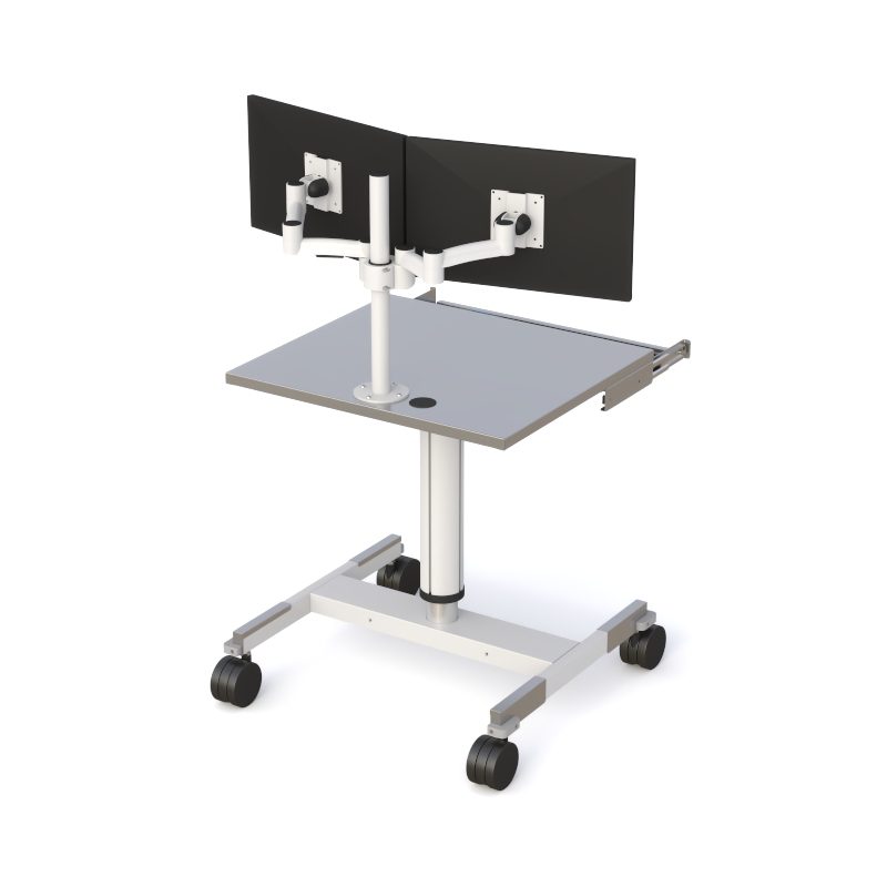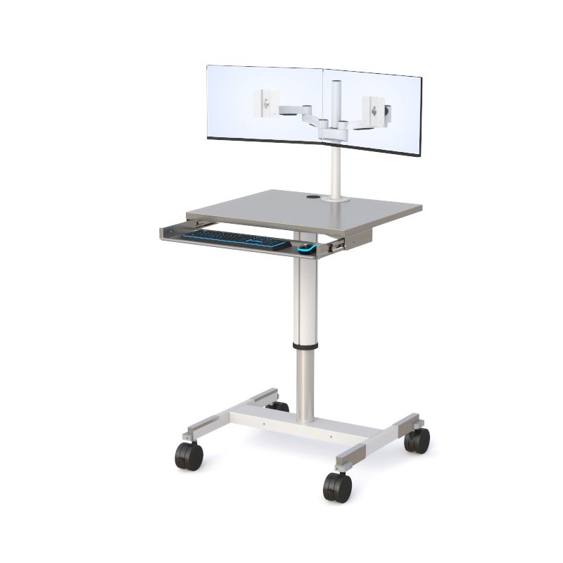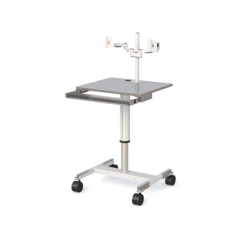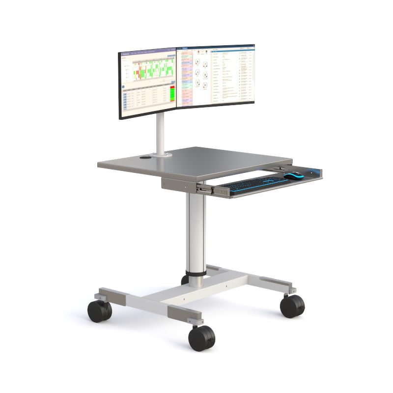 This cleanroom workstation features a stainless steel work surface, pneumatic height adjustment, and a retractable metal keyboard and mouse tray for ergonomic operation. Dual displays are supported via a Z-arm VESA monitor mount, while 4″ twin locking casters allow smooth mobility with secure positioning.