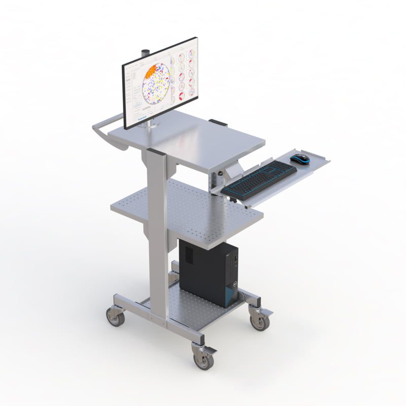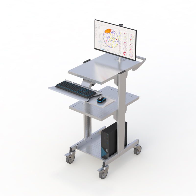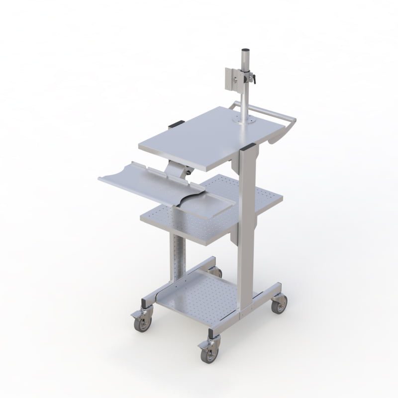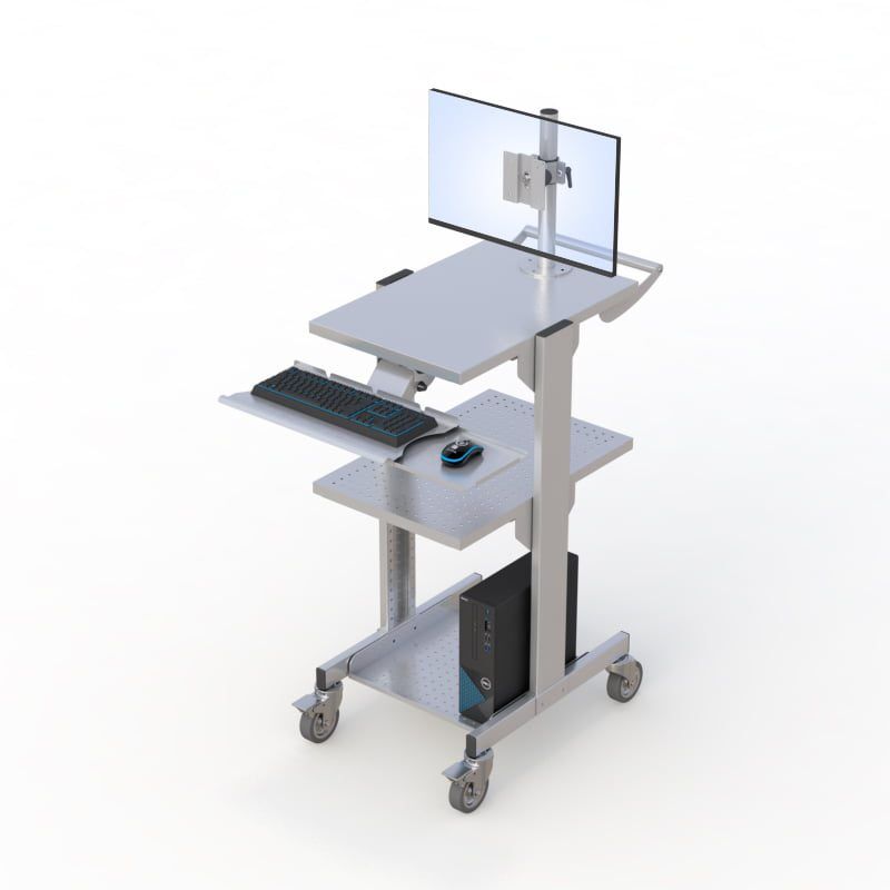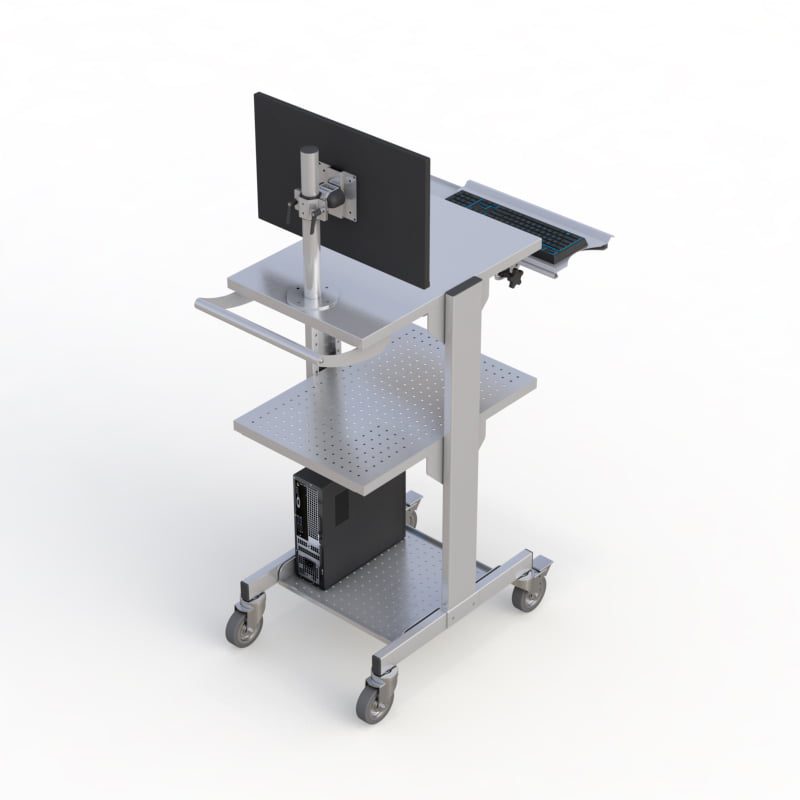 Mobile Cleanroom cart fixed-height for stability and sturdiness. This cart is can be equipped with either a single or dual monitor mount, a secure lower CPU shelf, an additional sturdy middle-height shelf, a stainless steel keyboard tray, and a large flat desktop surface and smooth-rolling anti-static casters for ease of maneuverability