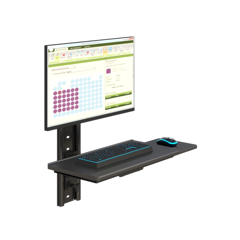 A space-saving wall-mounted workstation featuring a VESA-compatible monitor mount, sliding keyboard and mouse tray, and vertical wall track system. Designed for ergonomic use and efficient workspace organization in medical, industrial, and office environments.