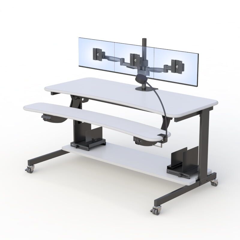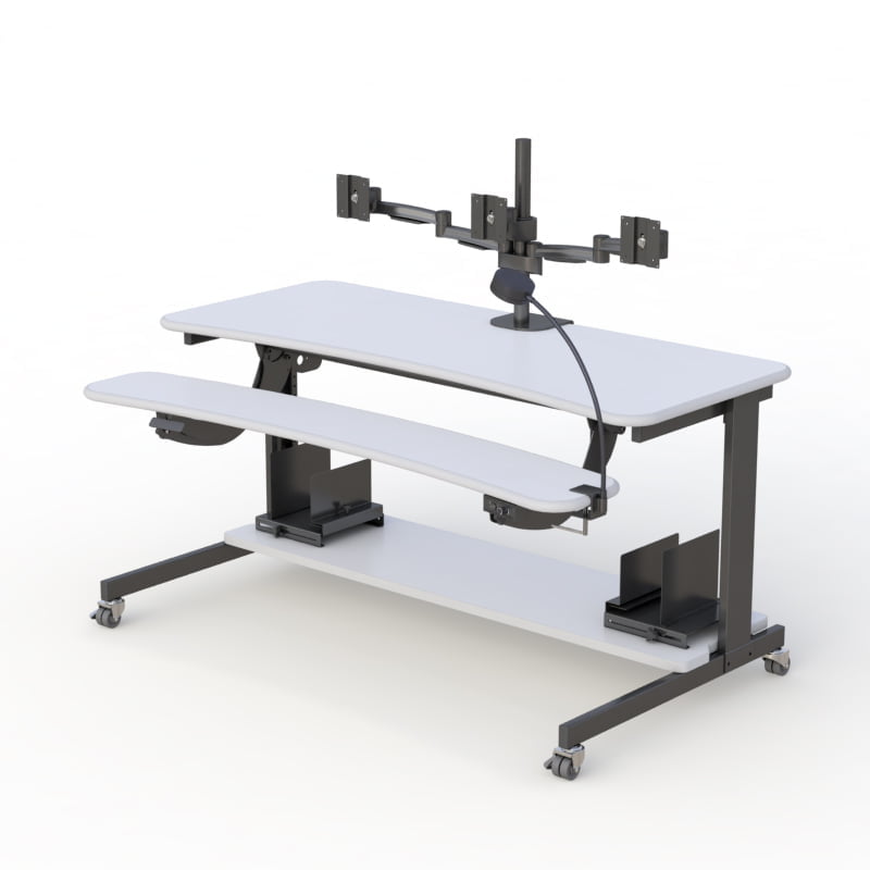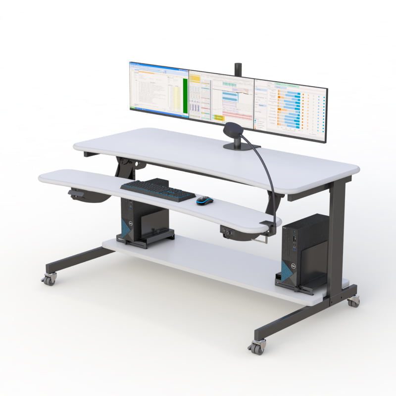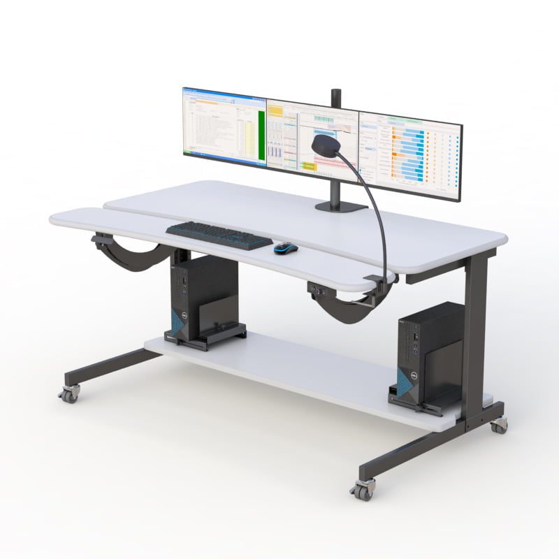 “text”: “Dual-level workstation desks separate monitor and keyboard surfaces to promote proper ergonomic alignment. This design reduces neck and wrist strain while improving posture and productivity during extended computer use.”