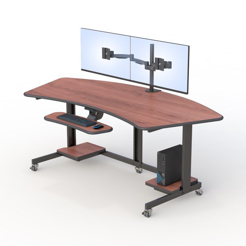 Increase your productivity with this ergonomic and functional dual monitor curved workstation with a wide desktop, dual VESA mount monitor desk stand, keyboard & mouse tray, 2-bottom CPU platform, and furniture glides.