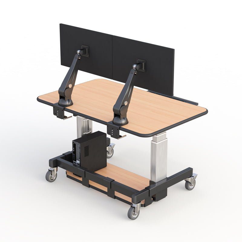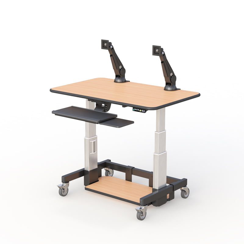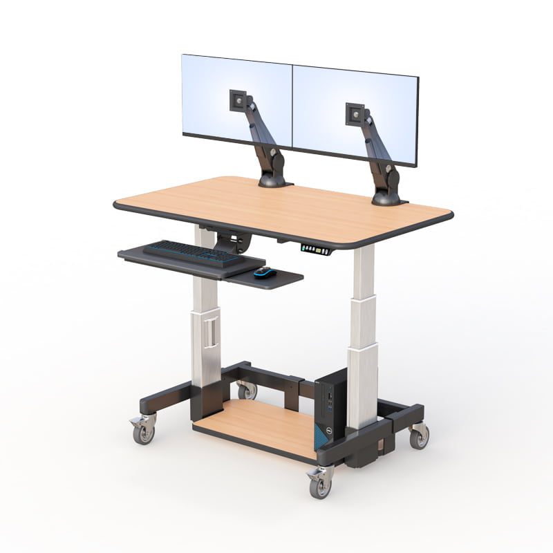 An ergonomic Computer Standing Office Desk that is complete with VESA compliant, dual monitor desk mount, and built-in keyboard arm holder. This desk also has a bumper molding work surface, lockable caster wheels for better floor grip, and a bottom shelf for more storage space.