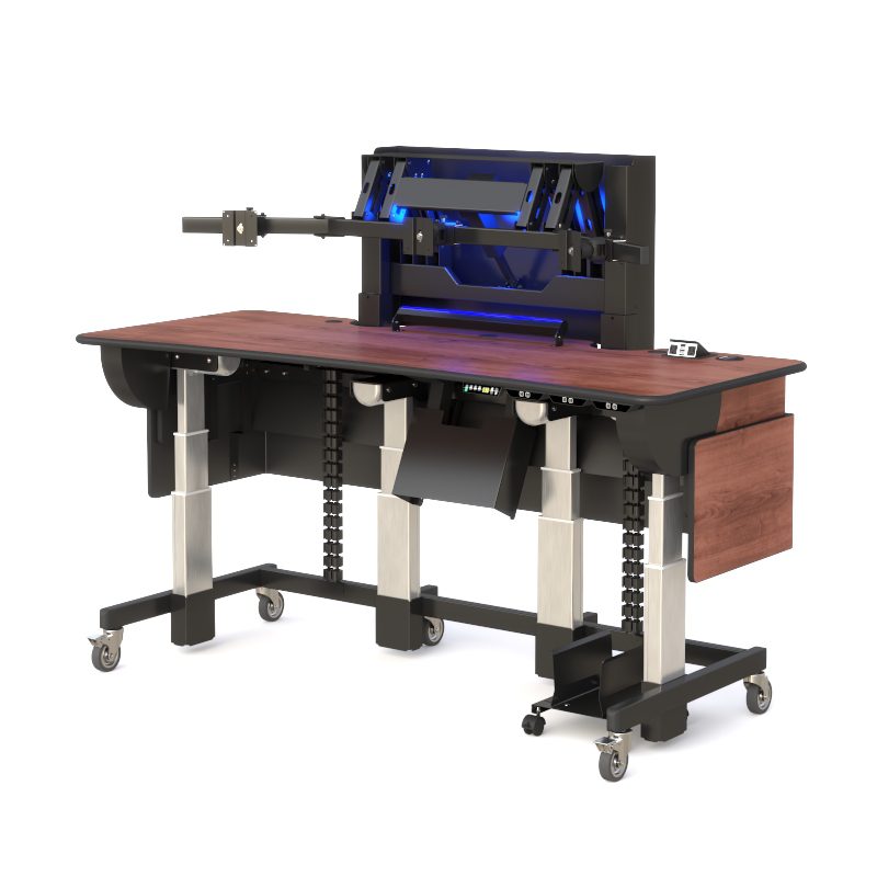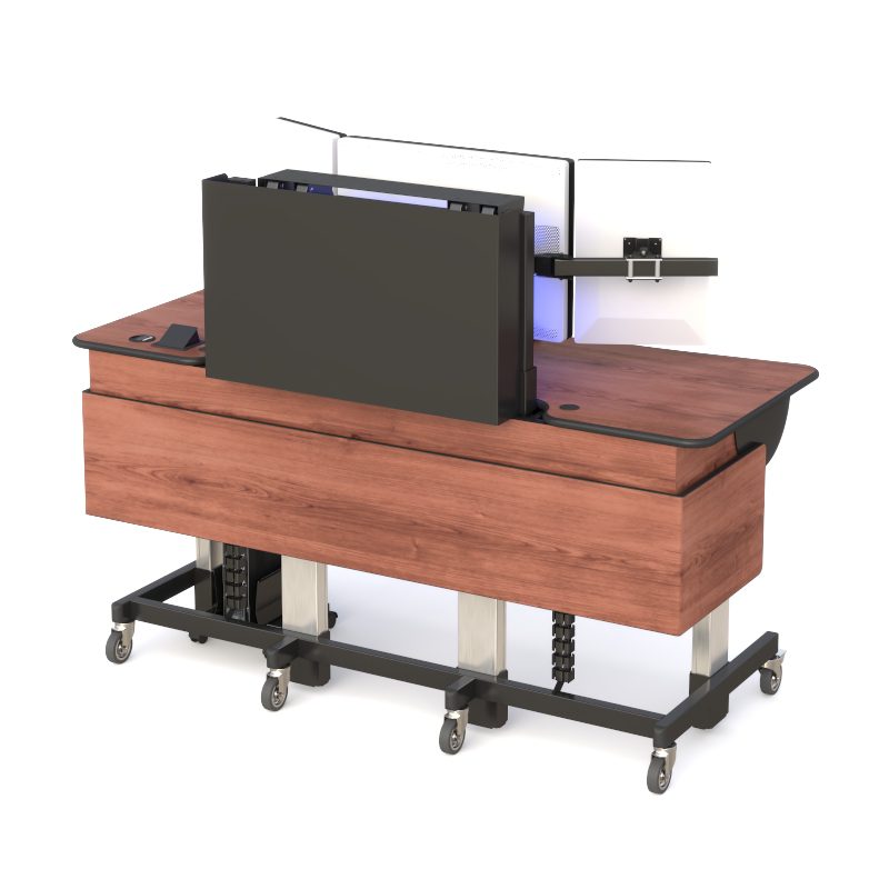 The pneumatic telescopic legs smoothly operate electronically through an easy to use control panel. The monitors are supported with retractable articulating arms for dynamic viewing angle configurations with cable wires neatly hidden and organized through a wire management system.