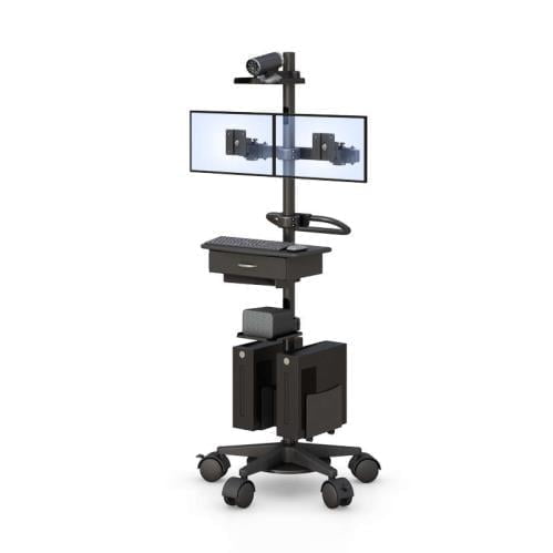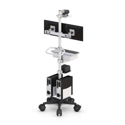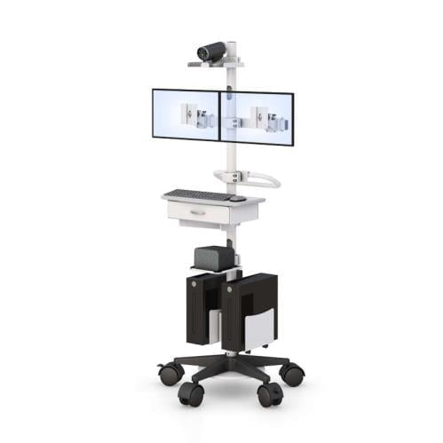 This Medical Mobile Workstation has 2 VESA monitor mounts, a video camera, a sliding drawer, a battery holder, 2 CPU holders, a base stabilizer, and 5 big casters.