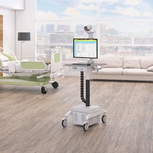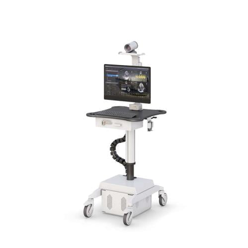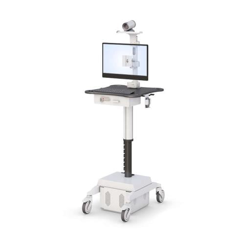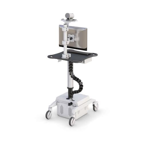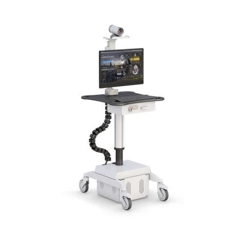 This single monitor telemedicine medical computer stand has a video conferencing camera mount, VESA monitor mount, keyboard and mouse desktop, mini drawer, pneumatic height adjust, battery power supply, and heavy-duty casters.