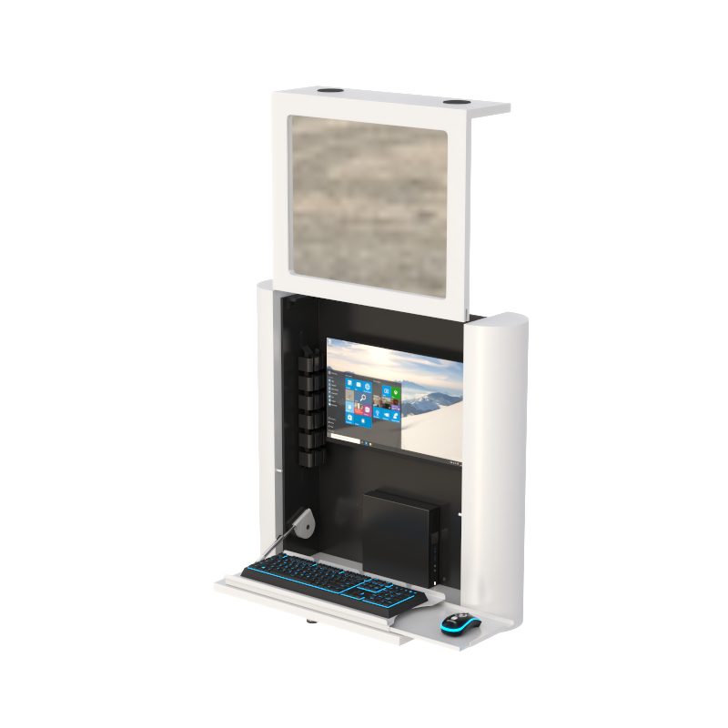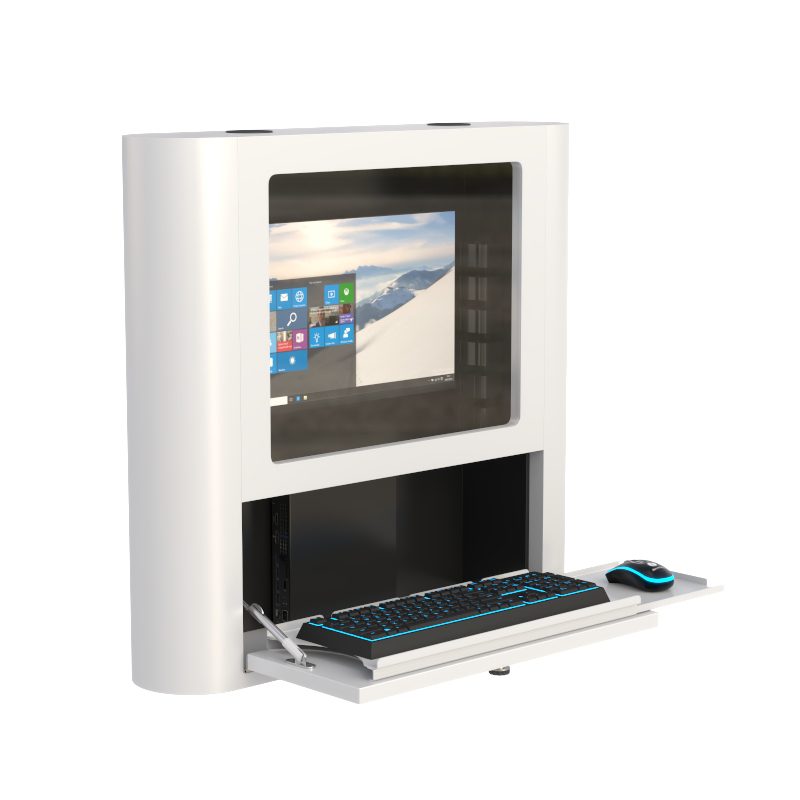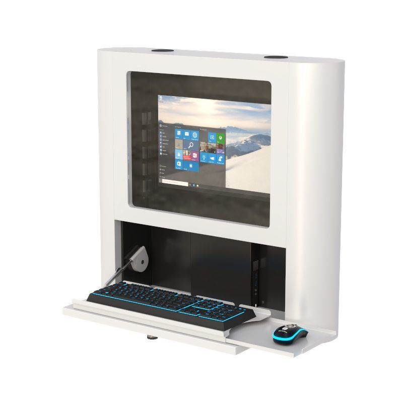This great quality lockable wall mounted computer workstation with removable monitor cover has added features such as a retractable keyboard and mouse tray is great for crowded hallways and high traffic areas require data access whenever needed without occupying limited floor space.