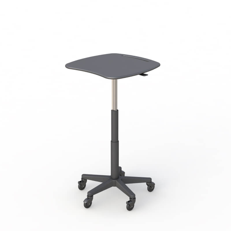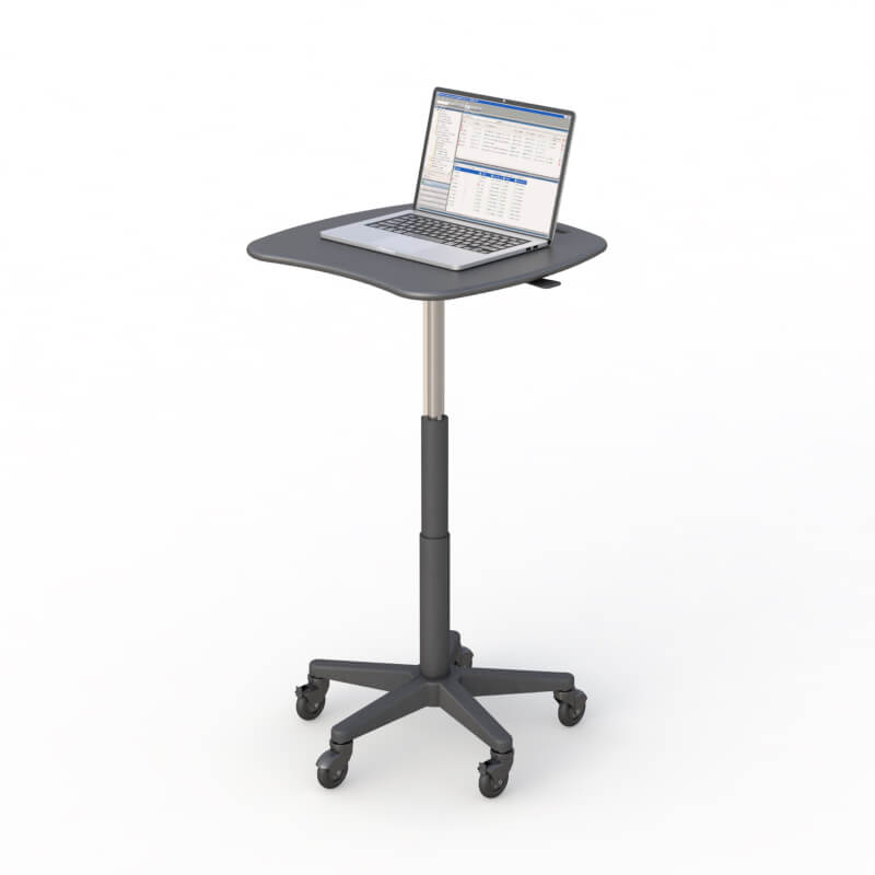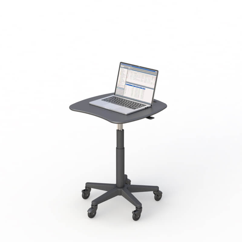Designed for mobility and ergonomic utility, this rolling laptop cart with an anti-microbial HDPE top can be easily disinfected. Ideal for research and healthcare environments. Height adjustment comes from the side pneumatic lever. The easy-glide caster wheels allow you to deliver data with mobile convenience.