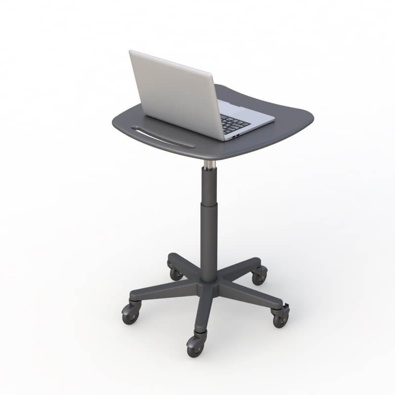 This Small Computer Laptop Cart is designed for mobility. It has an HDPE work surface, cart holder, pneumatic height adjustment, and a fully integrated handle.