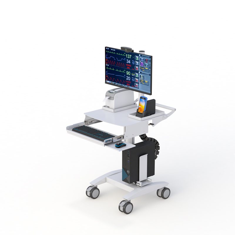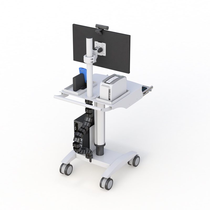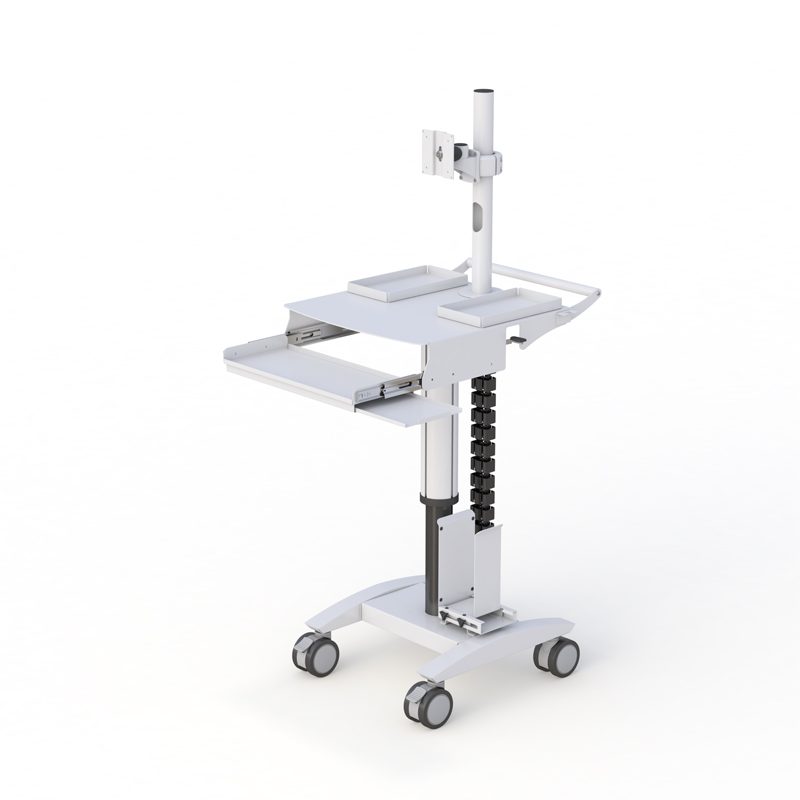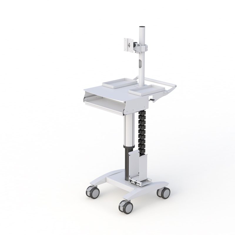 These Healthcare Computer Carts for medicine have an innovative design with superior pneumatic height adjustment for maximum convenience. Your priceless medical supplies and accessories can be safely stored in two independently locking security drawers on this cutting edge cart. It also has a neatly integrated retractable drop-down tray for holding a keyboard and mouse, which makes for an ergonomic and efficient workplace. Our finest Healthcare Computer Carts.