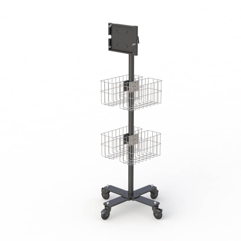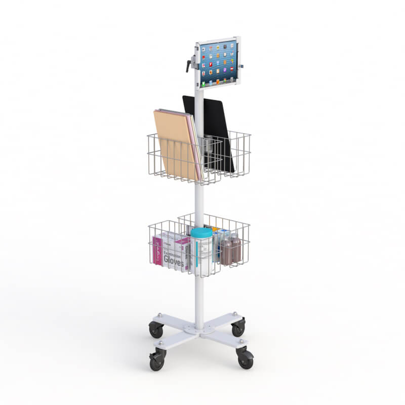 Mobile cart with tablet frame holder and quadruple wire storage baskets