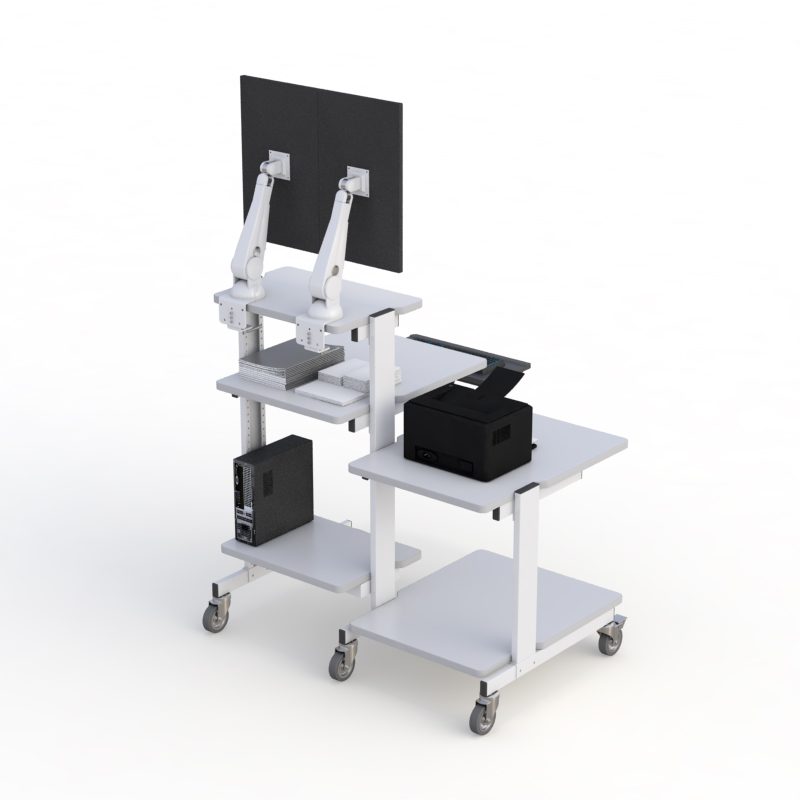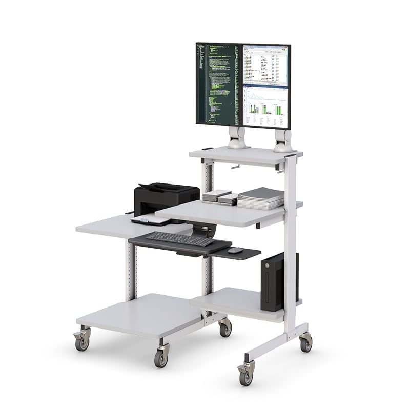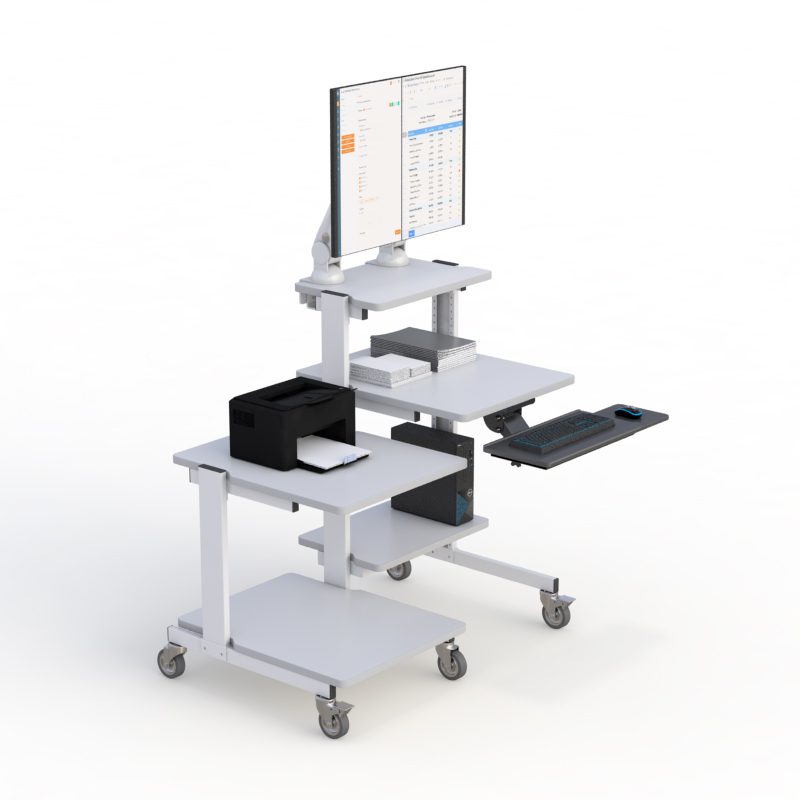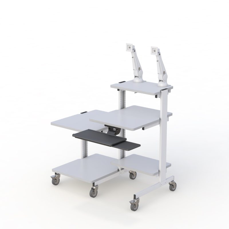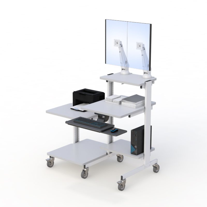 “text”: “A rolling computer workstation provides mobility, ergonomic adjustability, and efficient space utilization. It allows equipment to be transported easily between departments or work zones while maintaining organized cable management and stable device support.”