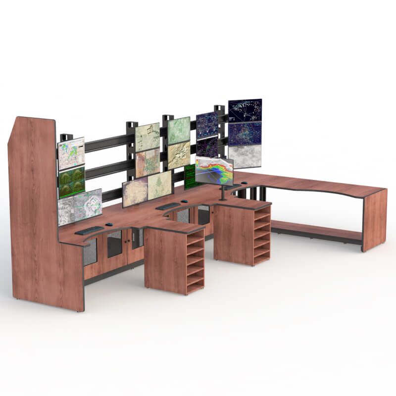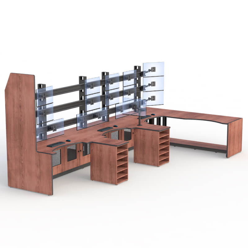 This control pod console is perfect for applications that require viewing multiple monitors simultaneously. Covering all critical areas of your facility with one integrated console or several consoles, using monitors of different sizes and configurations that comply with surveillance and security control standards.