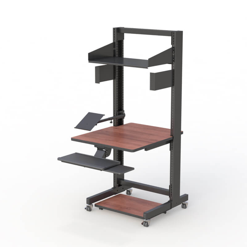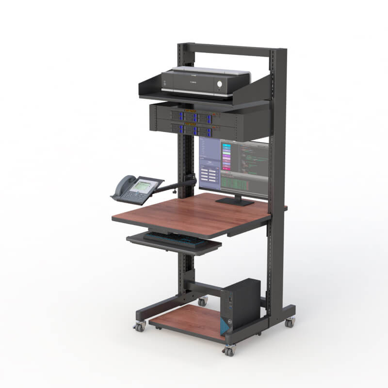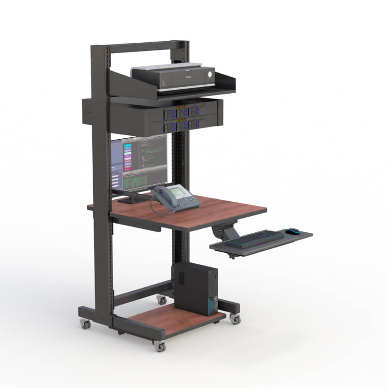 This Rack Mount workstation is equipped with a keyboard tray, CPU floor tray, casters, phone holder, wood laminated desktop, mounted CPU holder, and LAN switch holders.