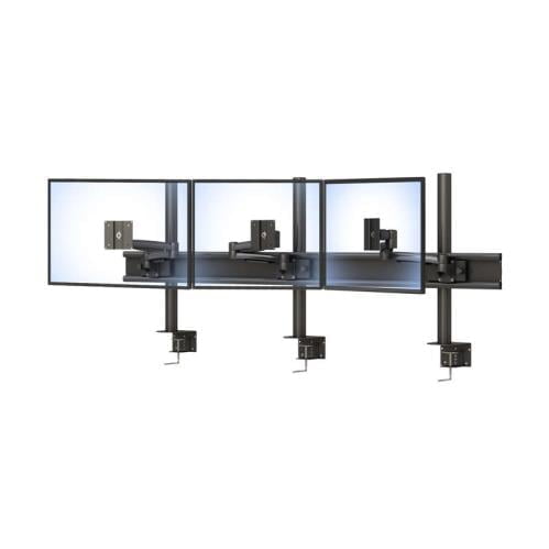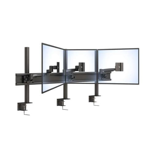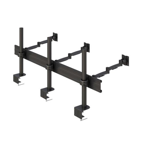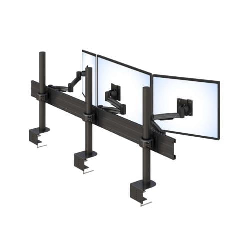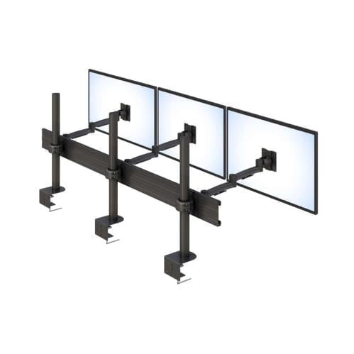 It consists of three individual single monitor stands, each with an articulating monitor arm. The individual stands are mounted on a horizontal track for stability. Each monitor arm has a VESA compliant monitor mount. This device is anti-rust coated to ensure long-lasting lifetime use.