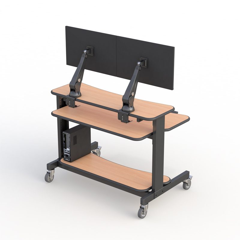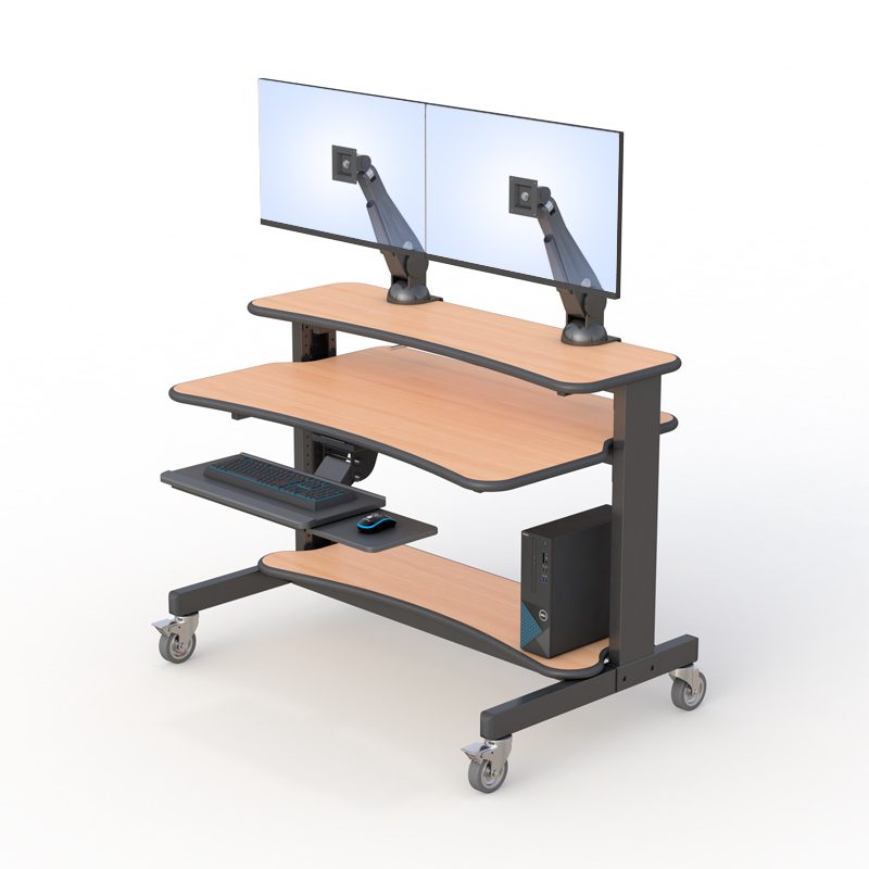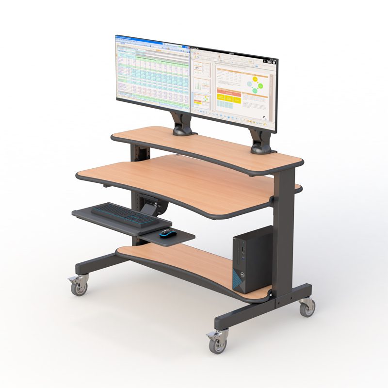 It features ergonomic design and flexibility. The IntelliCart a two-level computer desk with a keyboard tray gives you the versatility and mobility you have been looking for. Its smooth, fluid lines bring a relaxing touch to busy work environments. With an elegant yet simple design, it is a strong and comfortable workstation that is built to last.