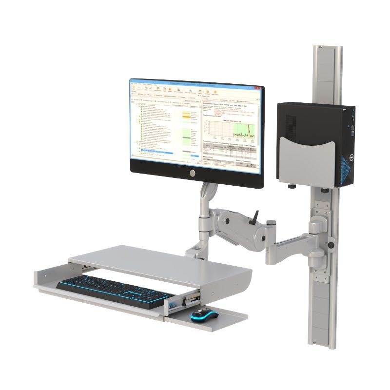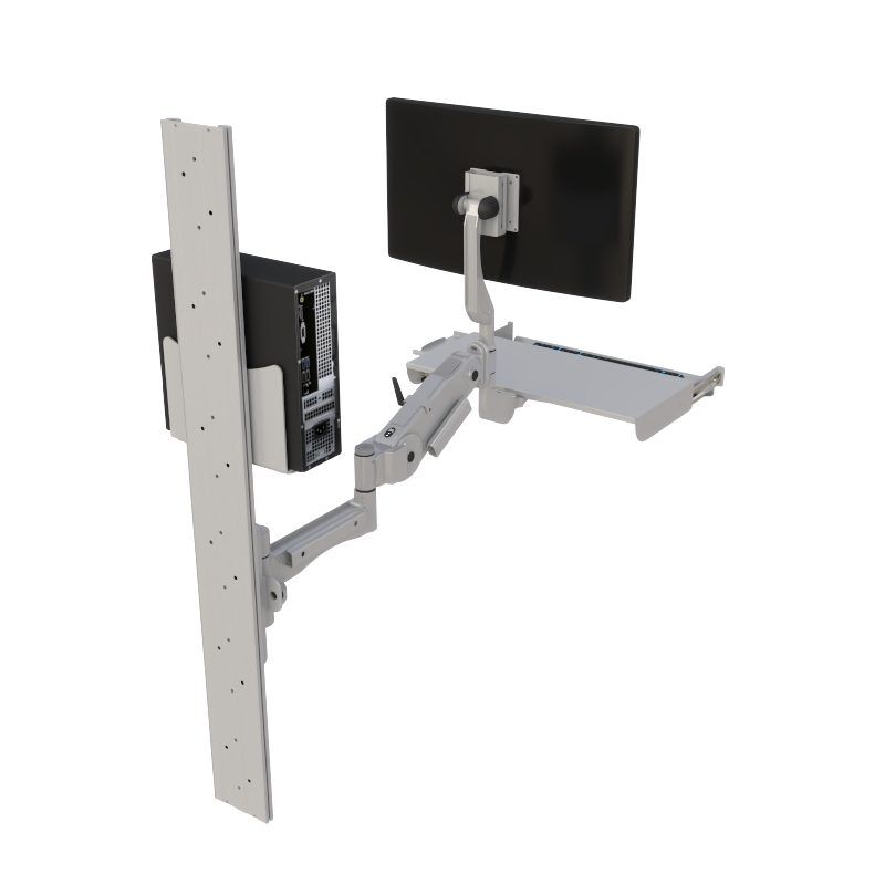 AFC’s Wall-Mounted Computer Workstation is a space-saving solution designed for ergonomic flexibility and reliable performance. Built from lightweight aluminum with a durable antimicrobial powder-coated finish, this workstation provides nearly three feet of reach when fully extended and easily folds back to the wall when not in use. The manual height adjustment offers a 12″ stroke with secure locking at any position, supporting both sit-to-stand use and varying load requirements. A full range of swivel motion at each joint allows versatile positioning, while the folding keyboard shelf, optional mouse tray, and scanner holder add functionality in compact form. Integrated wire management and a CPU mount keep workspaces organized, and the VESA 75/100 compliant monitor bracket ensures secure display mounting with tilt adjustment.