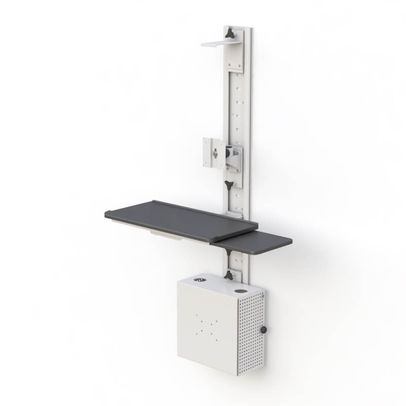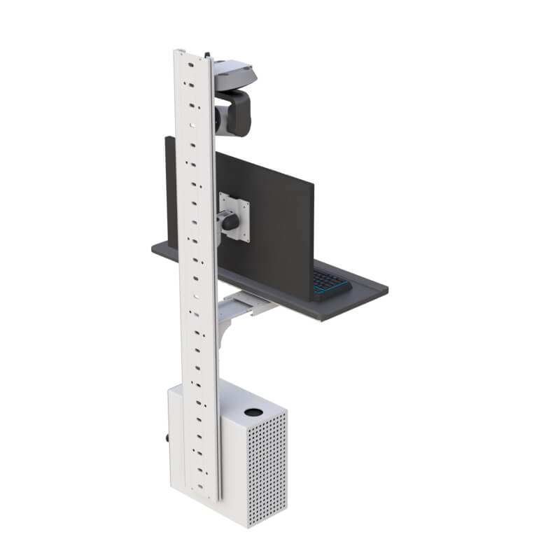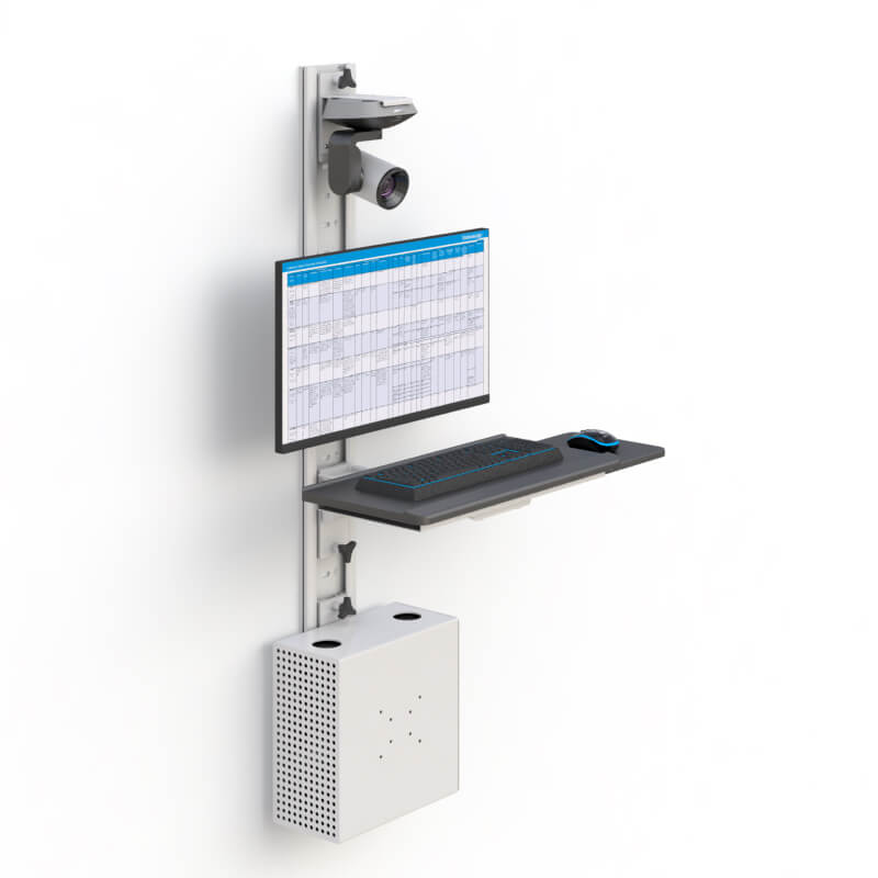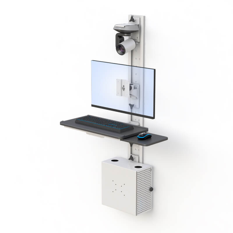 The Wall-Mounted Telehealth Workstation is designed for telemedicine, video conferencing, and space-saving workstations. Featuring a 48-inch adjustable vertical track, VESA-compatible monitor mount, enclosed CPU holder, camera mount, and an ergonomic keyboard tray with a sliding mouse platform, this setup offers optimal flexibility and efficiency.