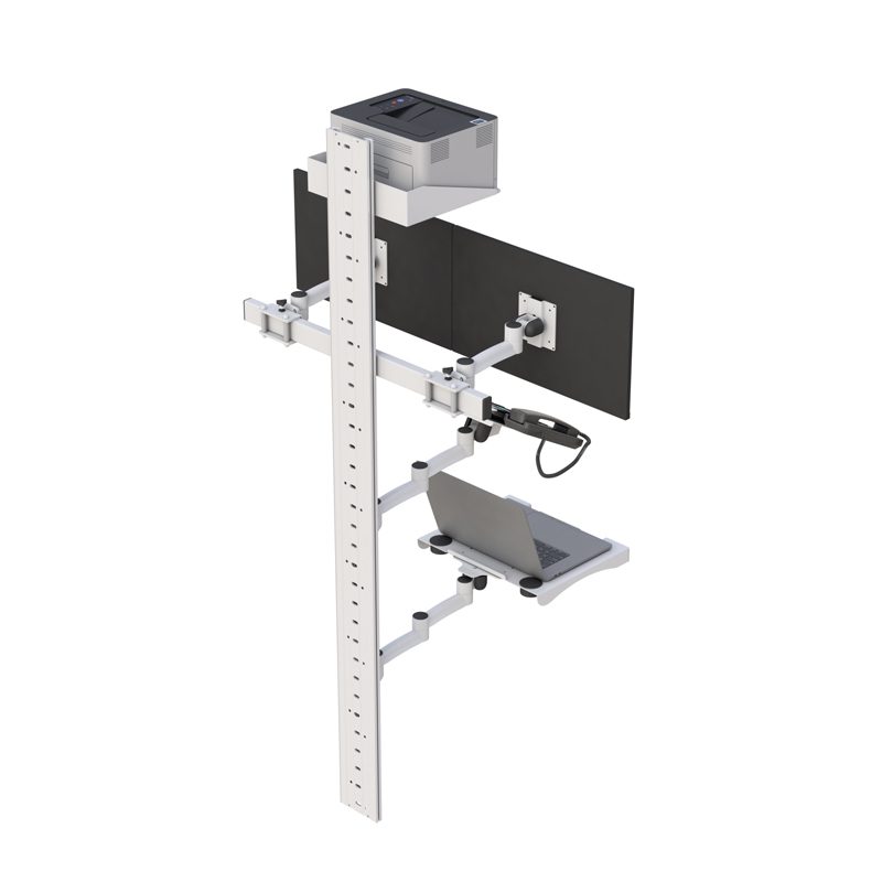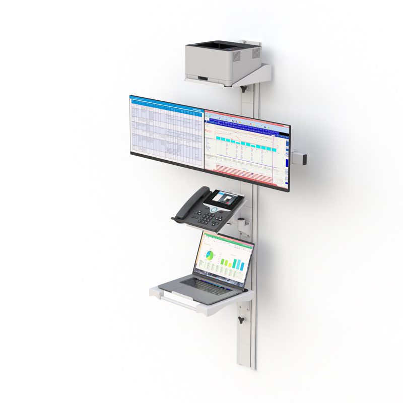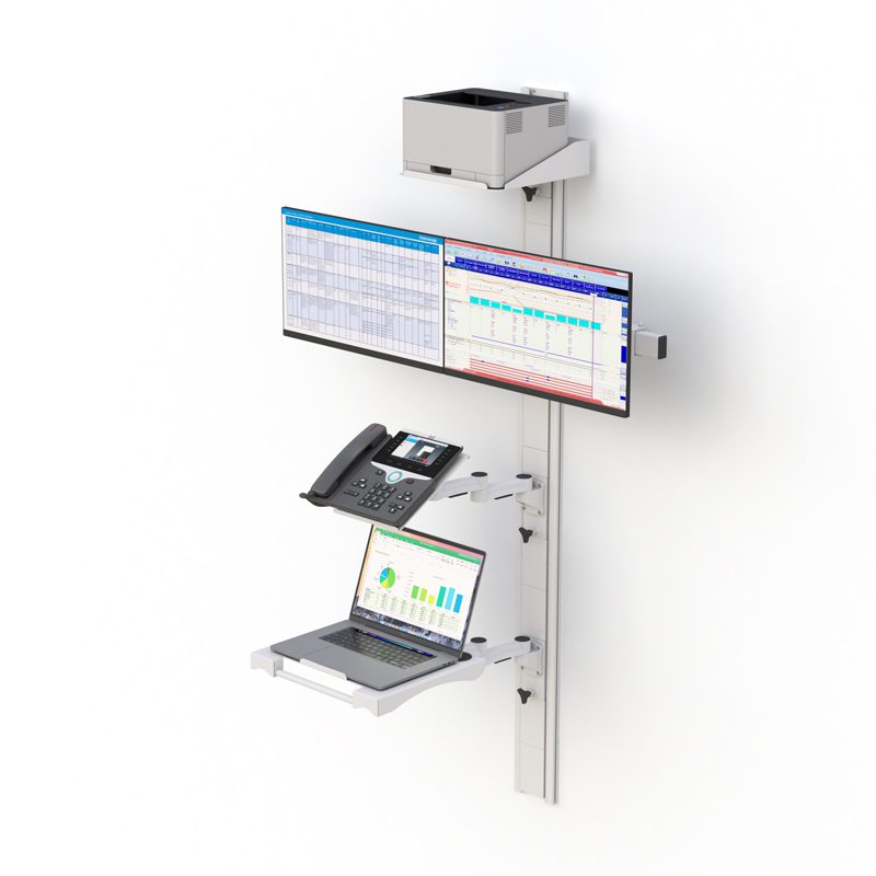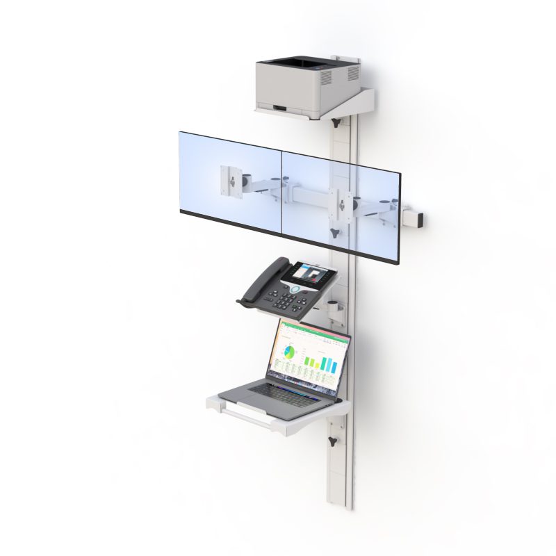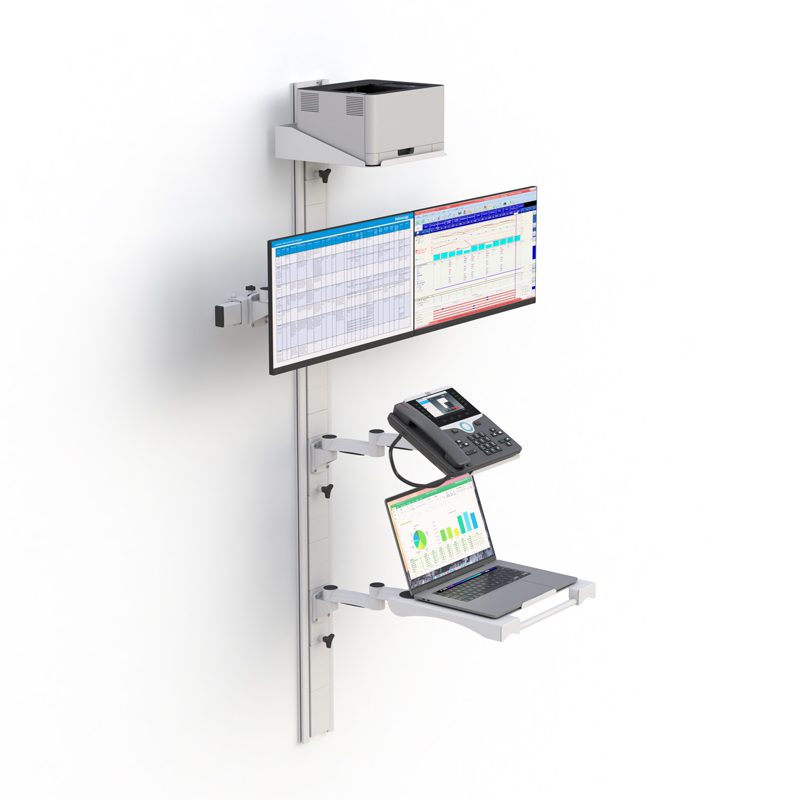 A Wall Mounted Track Computer Workstation with a dual-monitor display mount, keyboard and mouse tray arm, printer holder, and telephone holder arm all attached to a sturdy steel wall track. Made with high-grade materials and coated with anti-rust proofing to ensure more extended lifetime use.